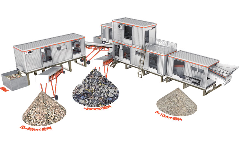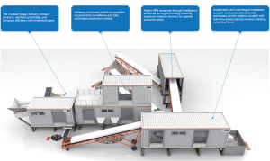 Module de tri de précision : des trieurs optiques intelligents identifient et éjectent les contaminants résiduels dans les matériaux de 10 à 80 mm, pour obtenir une teneur en impuretés inférieure à 5 %. Produit final : granulats fins de 0 à 10 mm ; granulats grossiers purifiés de 80 mm (éventuellement broyés à l'aide d'un concasseur à percussion) ; métaux ferreux ; fractions légères.